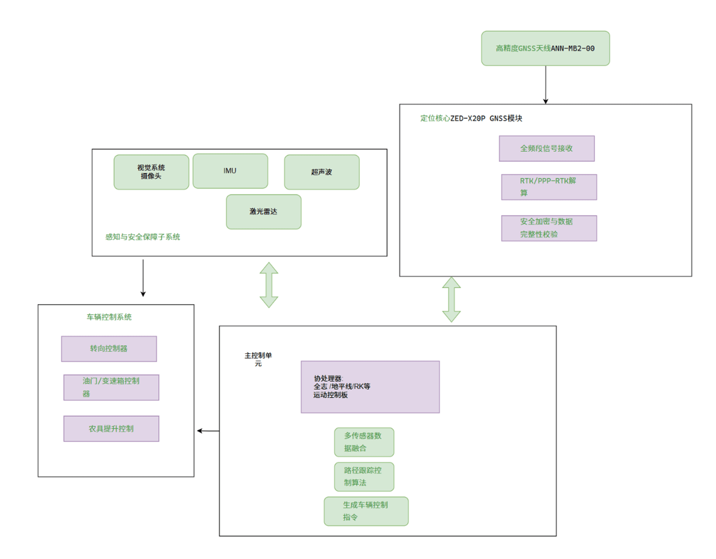 采用域控制器作为大脑。ZED-X20P作为高精度定位单元,通过串口(如UART)或CAN总线将位置、航向、时间等信息发送给域控制器。域控制器则同时接收来自IMU(获取姿态角速度)、摄像头、激光雷达等传感器的数据,运行融合算法,最终计算出控制指令,通过CAN总线发送给拖拉机的转向、油门和农具控制系统。