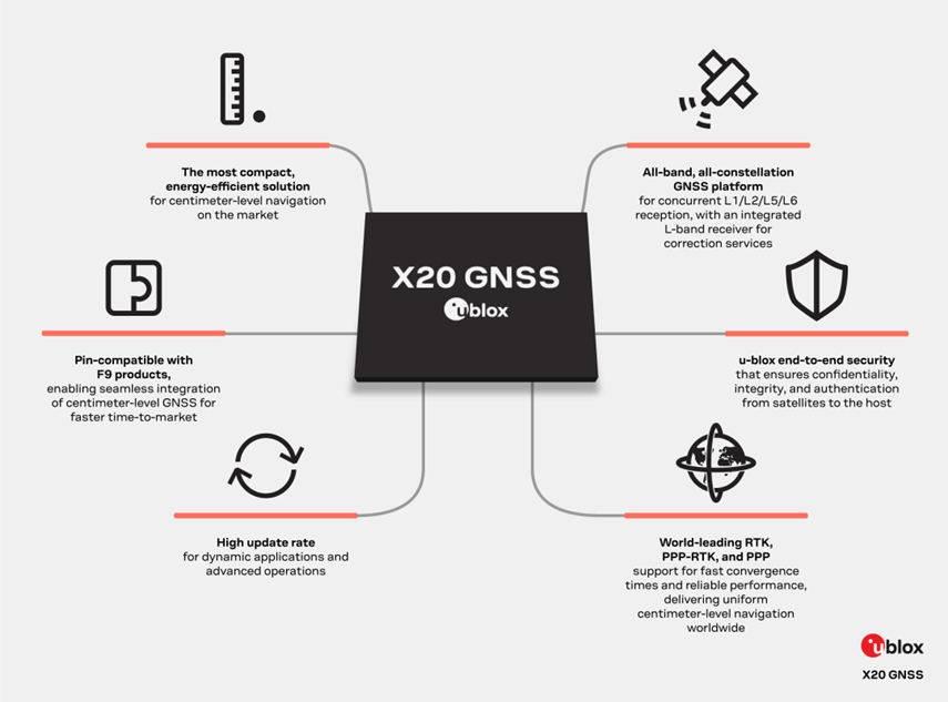 U-blox ZED-X20P全频段高精度GNSS模块,它能够接收来自GPS、Galileo、北斗、QZSS和NavIC卫星的所有GNSS频段(包括L频段)的信号。在单芯片接收器上的集成度高,可实现全新的系统架构,为工业导航和机器人市场(产品如:无人驾驶车辆 (UAV)、导引系统和自动转向应用)创造价值。